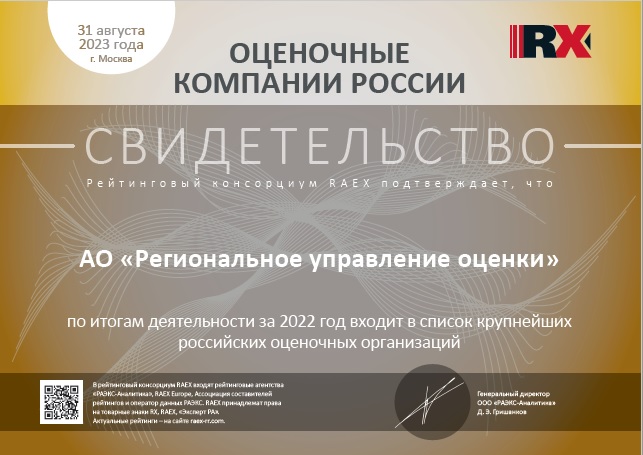 По итогам очередного ежегодного выпуска рэнкингов оценочных компаний, подготовленного агентством RAEX («РАЭКС-Аналитика») за 2022 год, компания АО «Региональное управление оценки» упрочила свое положение ТОП 100 ренкинга делового потенциала оценочных организаций РФ, а также среди крупнейших оценочных организаций Северо-Западного федерального округа.